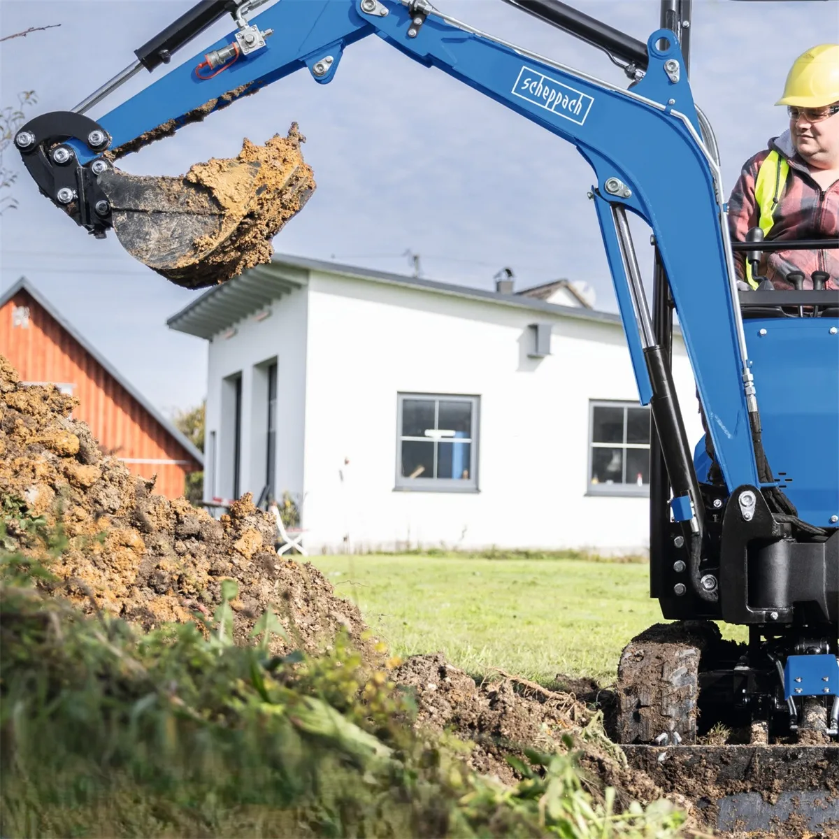 - Scheppach EXC 1400 je kompaktní minibagr s provozní hmotností 1010 kg, který díky štíhlé konstrukci a nastavitelné šířce pásů 720–900 mm projede úzkými průchody i stísněnými prostory. Robustní gumové pásy o šířce 180 mm lze ovládat nezávisle, což zajišťuje přesné manévrování. Maximální rychlost stroje je 1,8 km/h a zvládne stoupání až 15°.
