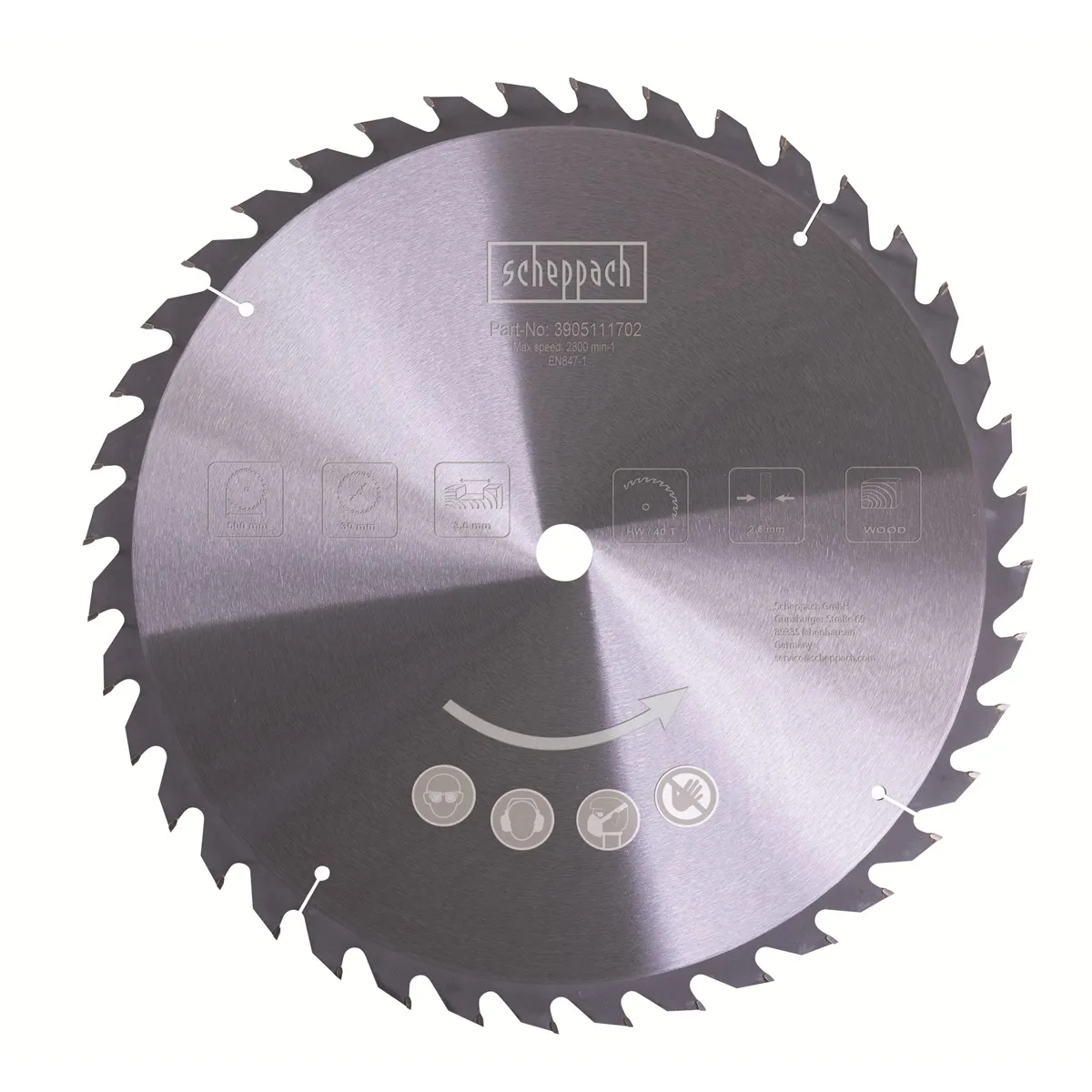 - Kvalitní pilový kotouč z tvrdokovu o průměru 500 mm, speciálně určený pro kolébkové pily Scheppach HS 510 a HS 550.