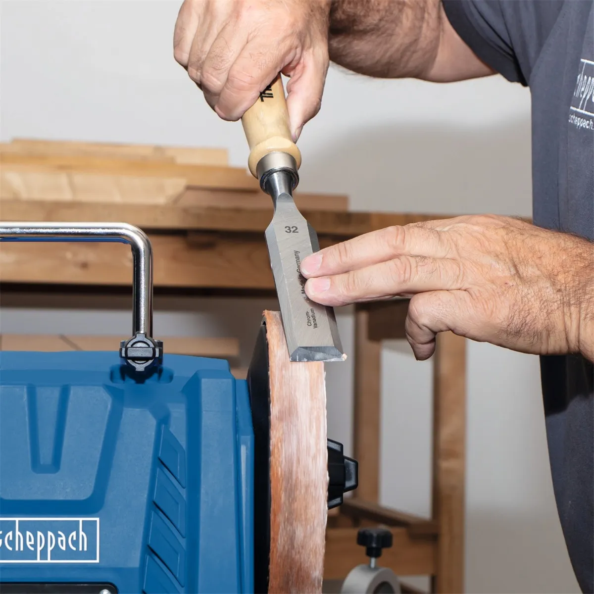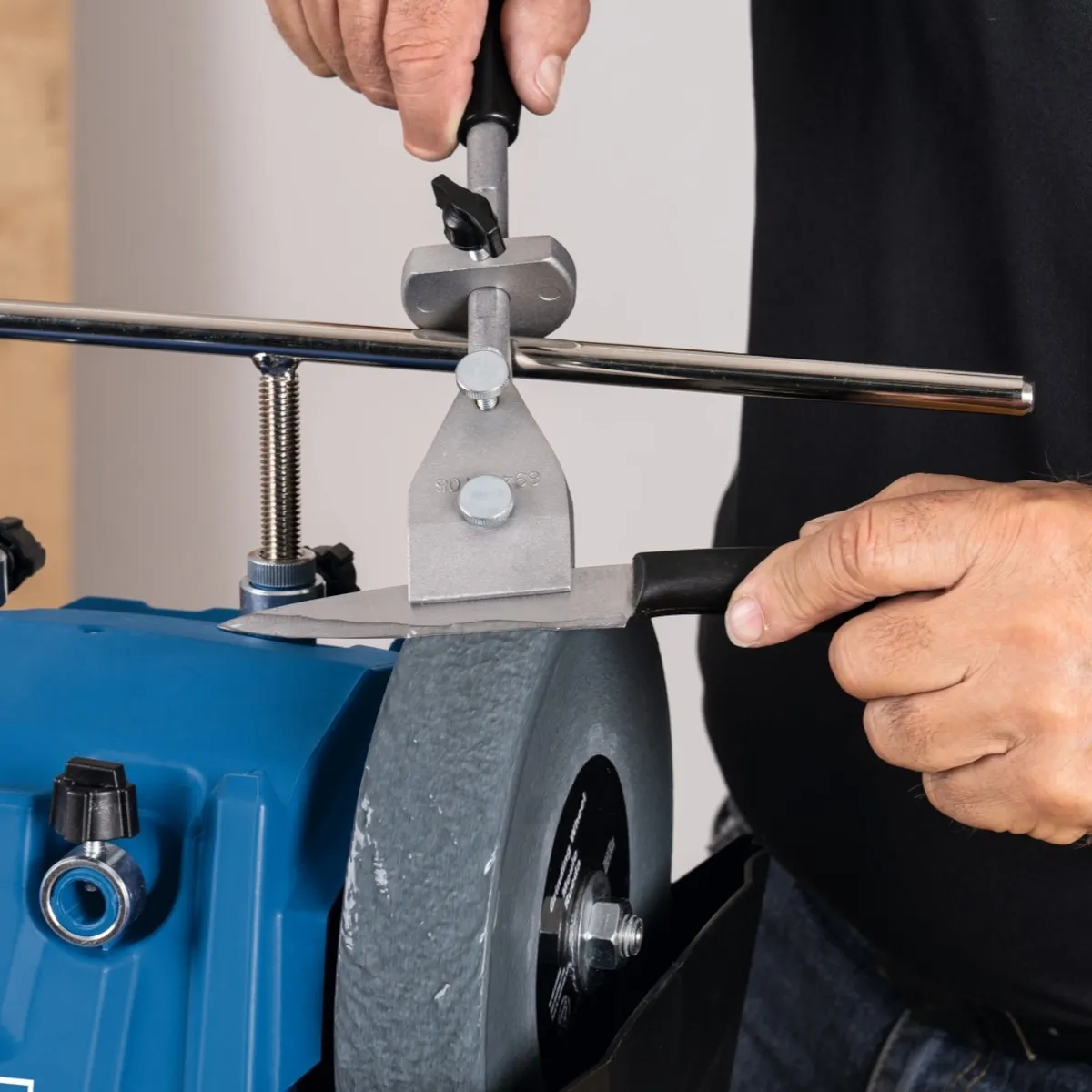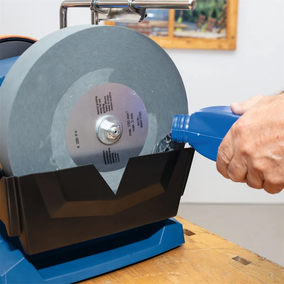 - Základem kvalitního ostří je široký brusný kámen o průměru 200 mm s mikročásticemi oxidu hlinitého, díky kterým lze brousit i nástroje z tvrdokovu. Pro finální úpravu a zahlazení mikrootřepů slouží vyměnitelný honovací kožený kotouč.