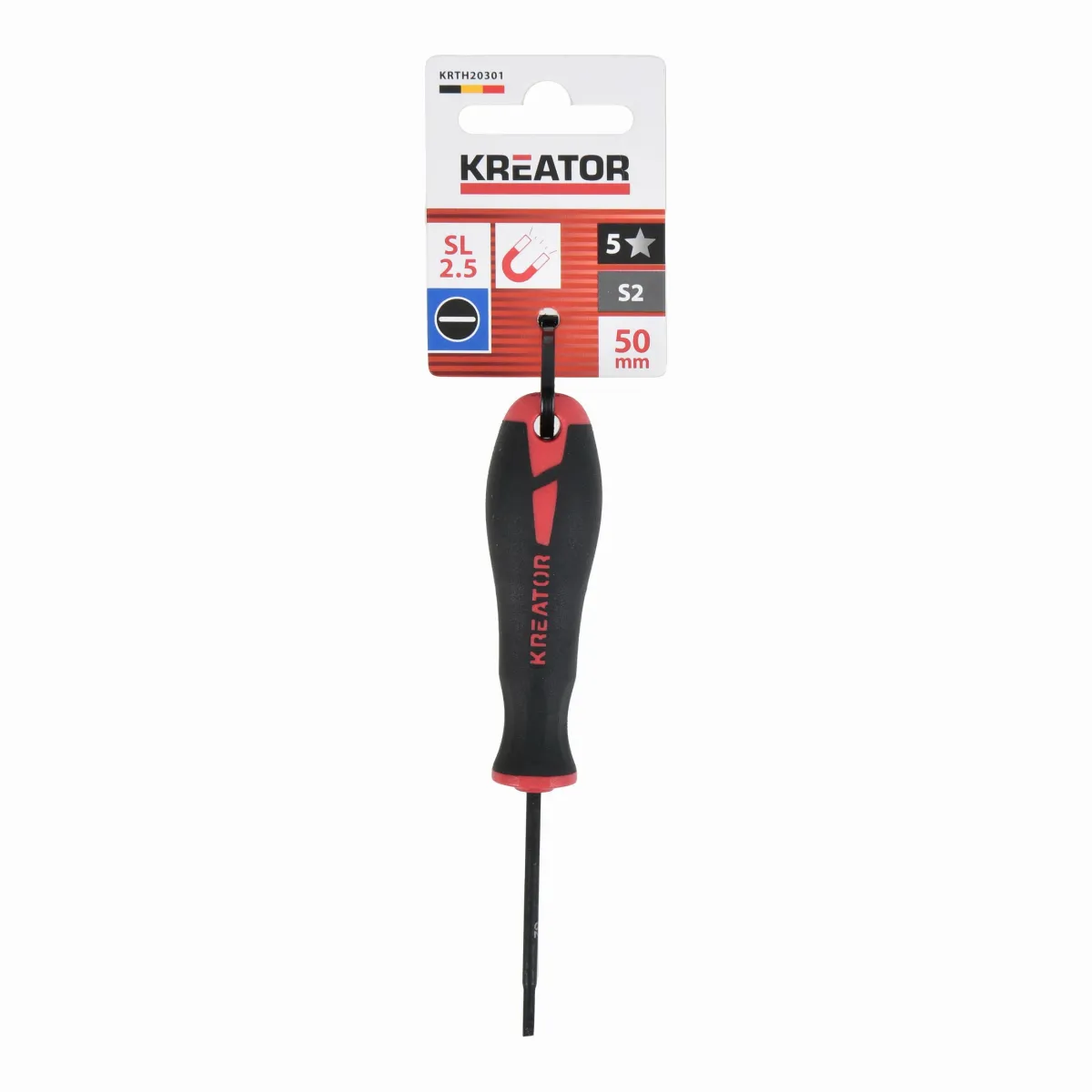 - Tento plochý šroubovák 2,5 KRTH20301 z naší řady Kreator má 50 mm dlouhou stopku a je vyroben z vysoce kvalitní oceli S2.