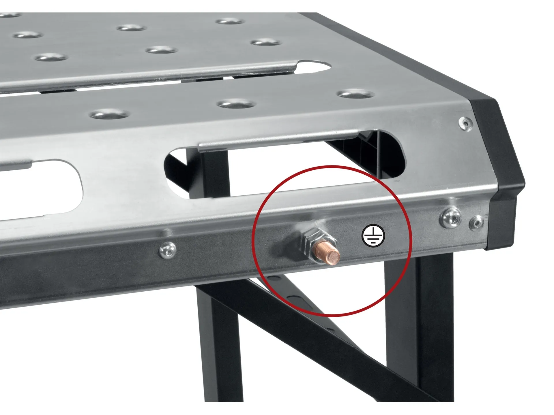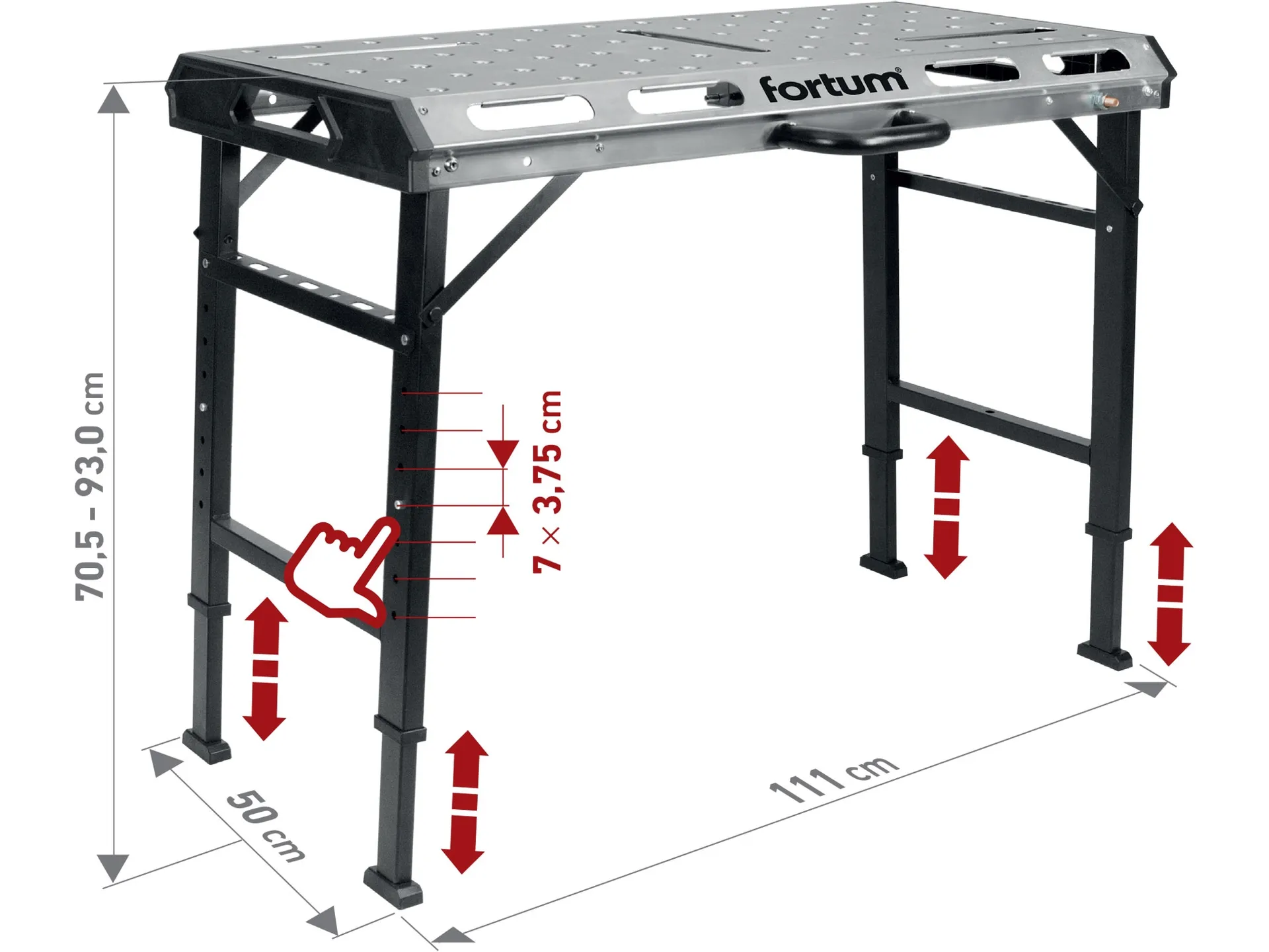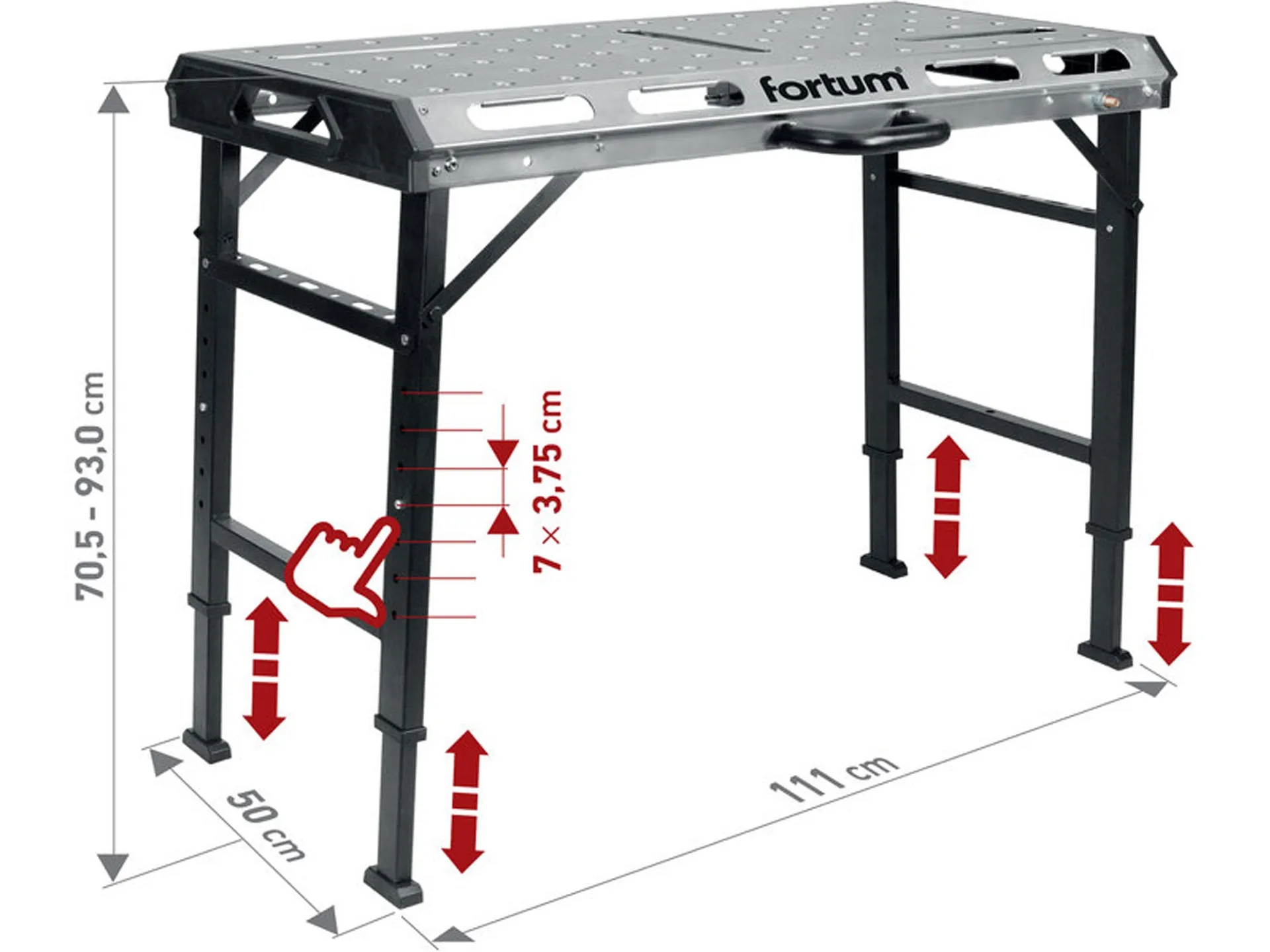 - Přenosný svařovací stůl FORTUM s výškovým nastavením pracovní plochy o rozměrech 107x53cm vyrobené z galvanizovaného ocelového 2mm tlustého plechu s množstvím manipulačních výřezů a otvory o průměru 20mm pro vymezovací/opěrné zarážky nebo upínací svěrky Max. nosnost stolu je 454kg .