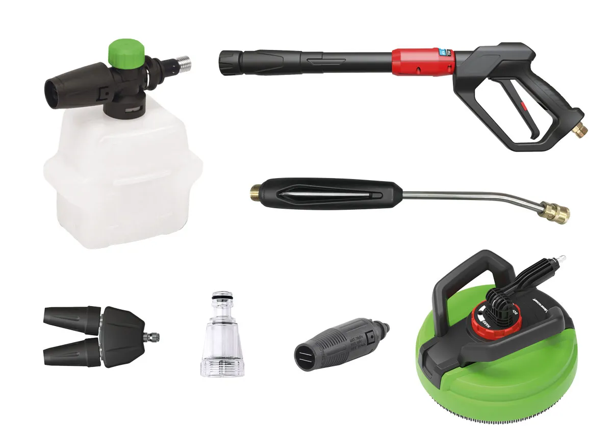 - Praktické držáky pro stříkací pistoli, trubici, vysokotlakou hadici a napájecí kabel