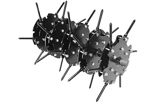 - Provzdušňovač je vybaven 3mi odnímatelnými závažími pro zvýšení tlaku na zem v tvrdší půdě. S hmotnostmi 2 x 16 kg a 1 x 25 kg nabízejí závaží o celkové hmotnosti 57 kg, což zajišťuje plné proniknutí do země.