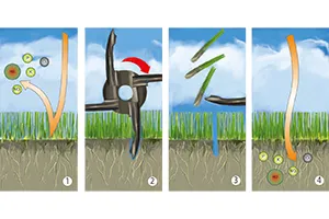 - - přivádí vzduch a živiny ke kořenům trávníku