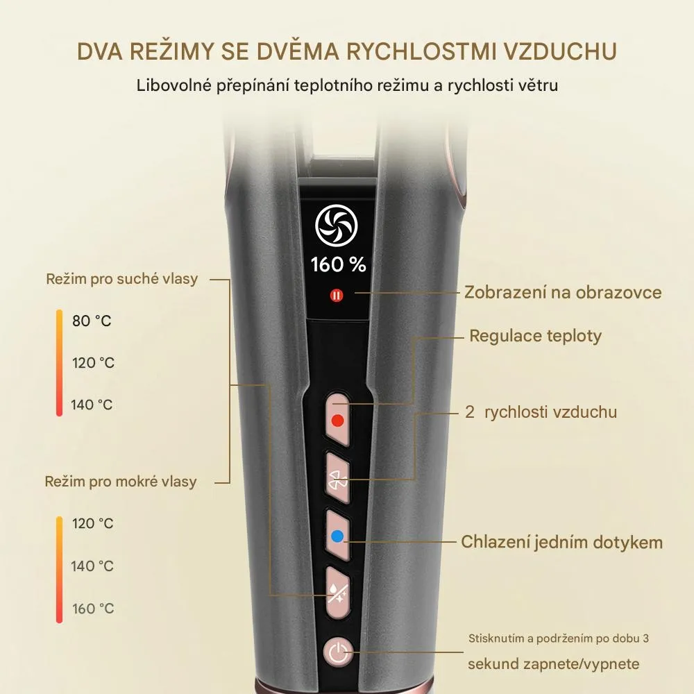 - Nastavit si můžete dvě rychlosti proudění vzduchu, což vám umožňuje přizpůsobit nastavení podle vašich potřeb a typu vlasů.